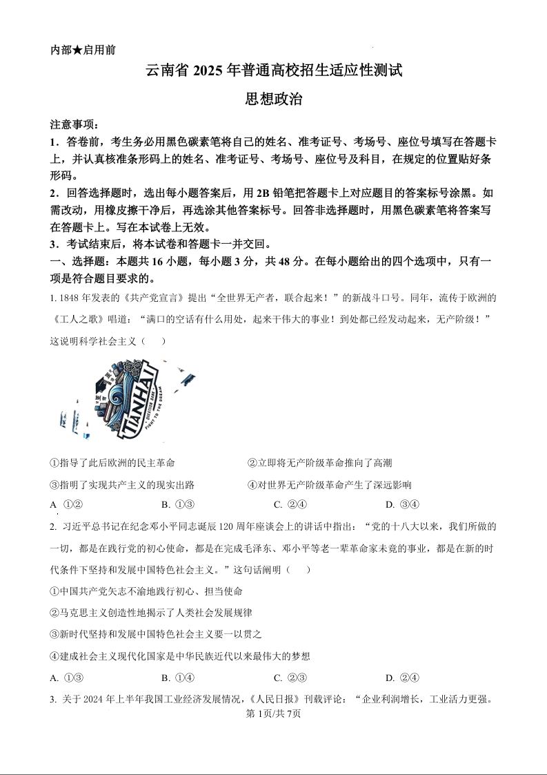 新八省联考2025年云南省高考综合改革适应性演练政治(原卷版)