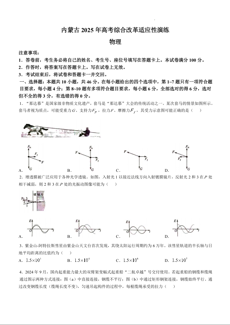 【内蒙古卷】新八省联考2025年内蒙古高考综合改革适应性演练物理