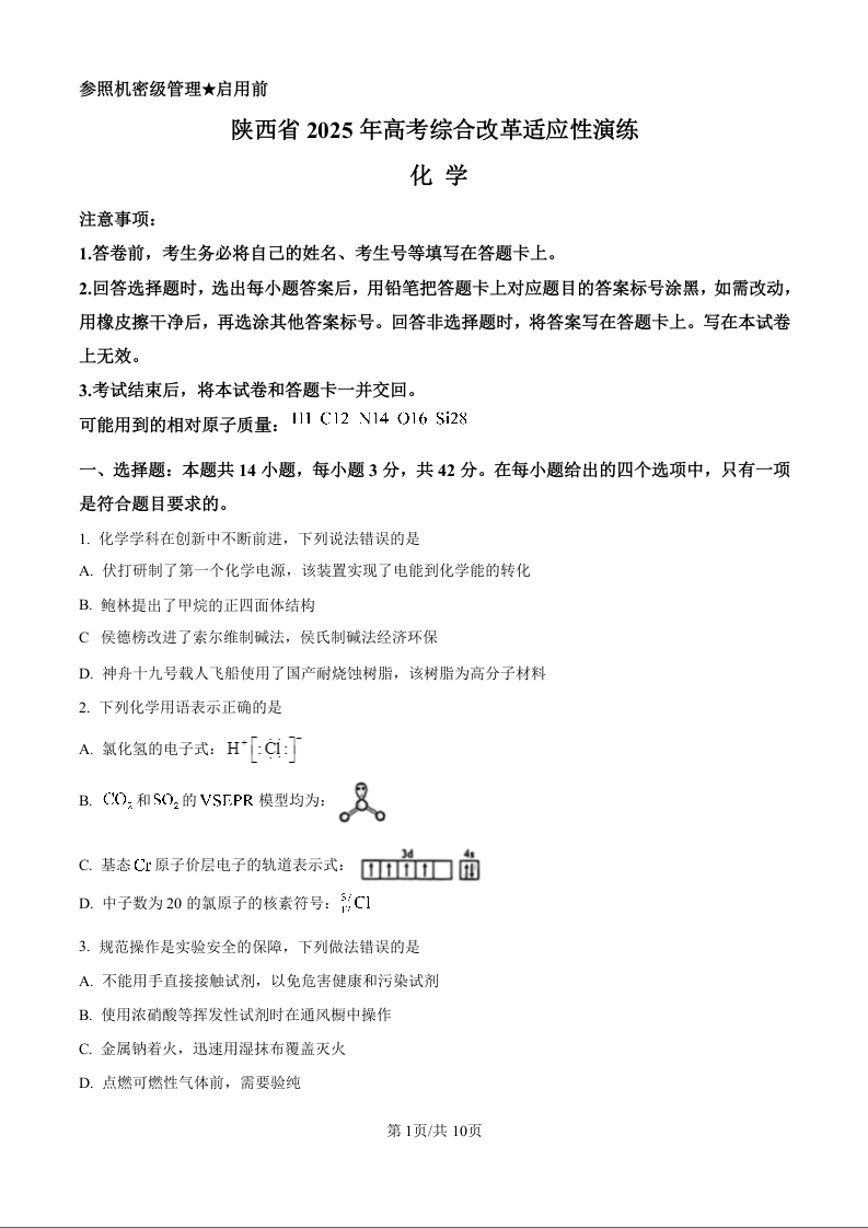 【陕西、山西、宁夏、青海】新八省联考2025年高考综合改革适应性演练化学(原卷版)