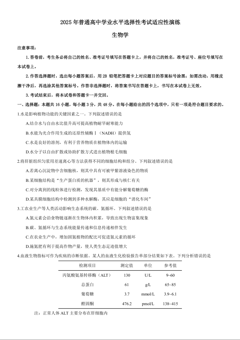 【陕西、山西、宁夏、青海】新八省联考2025年高考综合改革适应性演练生物
