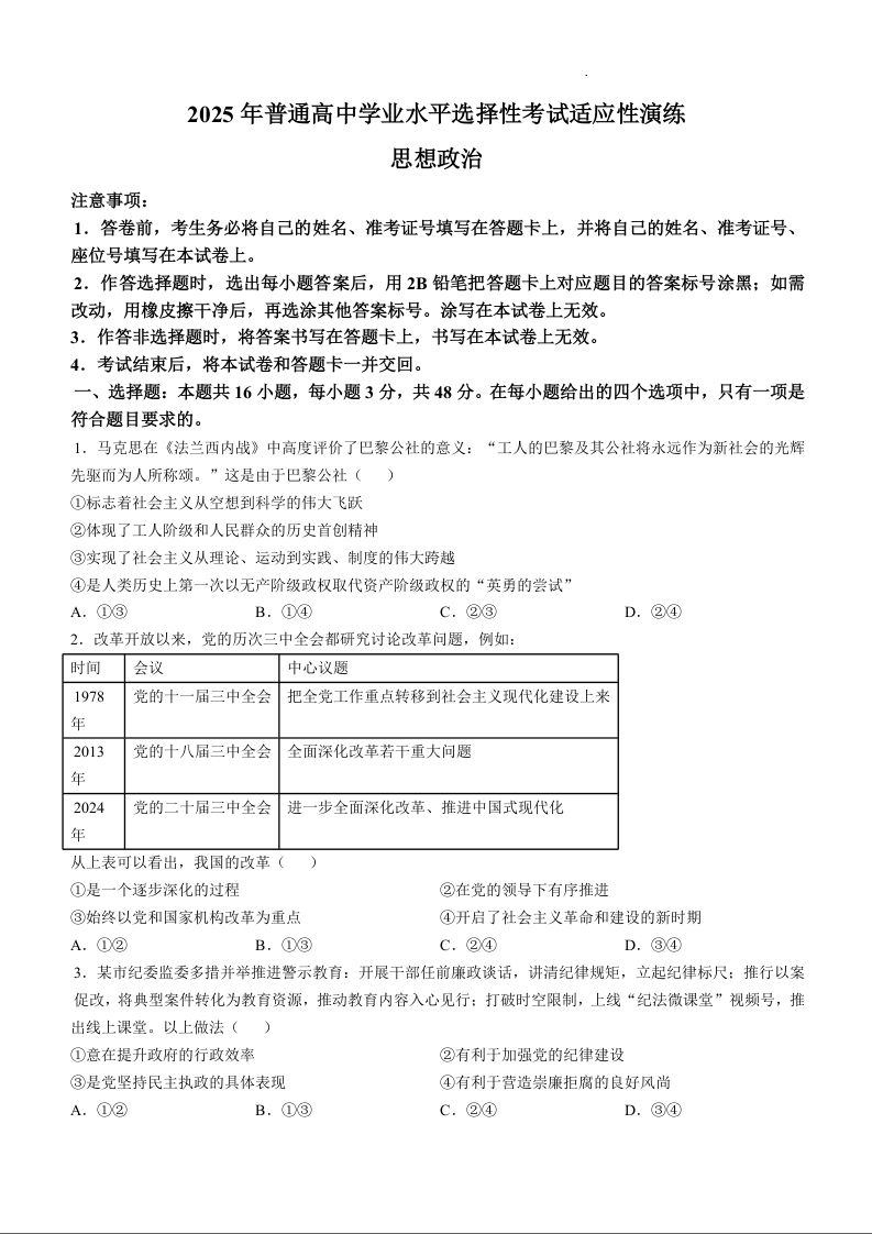 【陕西、山西、宁夏、青海】新八省联考2025年高考综合改革适应性演练政治