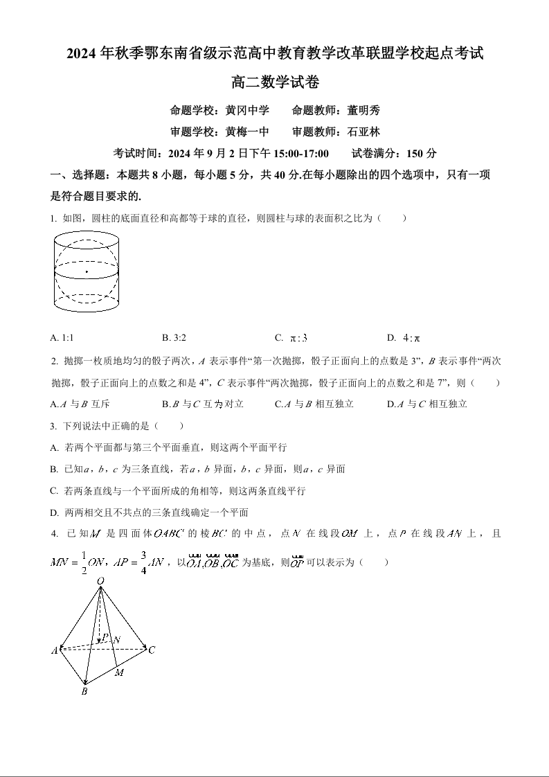 湖北省鄂东南三校2024-2025学年高二上学期开学联考数学(原卷版)