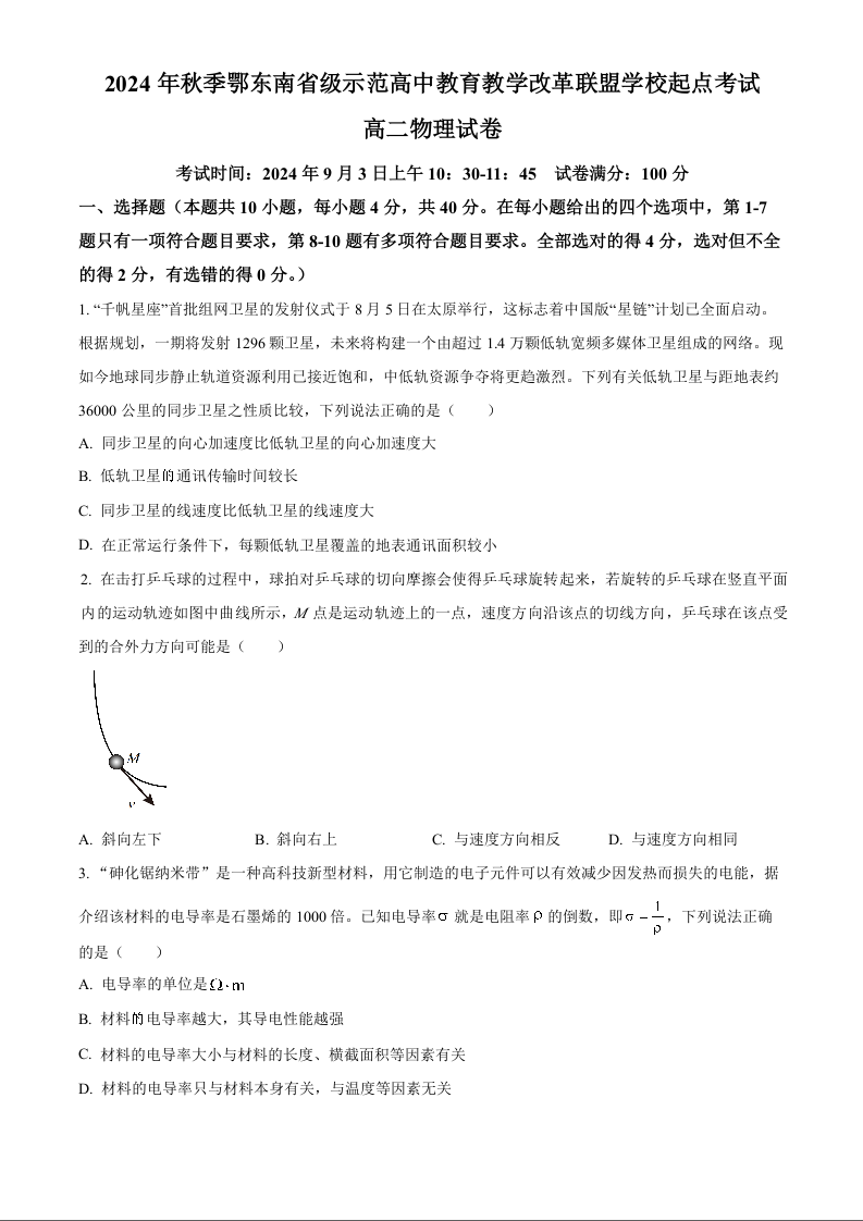 湖北省鄂东南三校2024-2025学年高二上学期开学联考物理+答案
