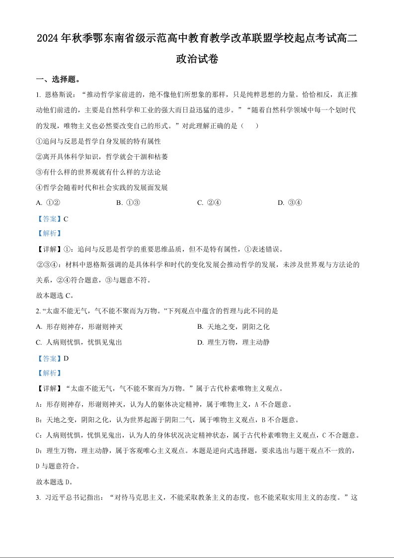 湖北省鄂东南三校2024-2025学年高二上学期开学联考政治+答案(精品解析版)