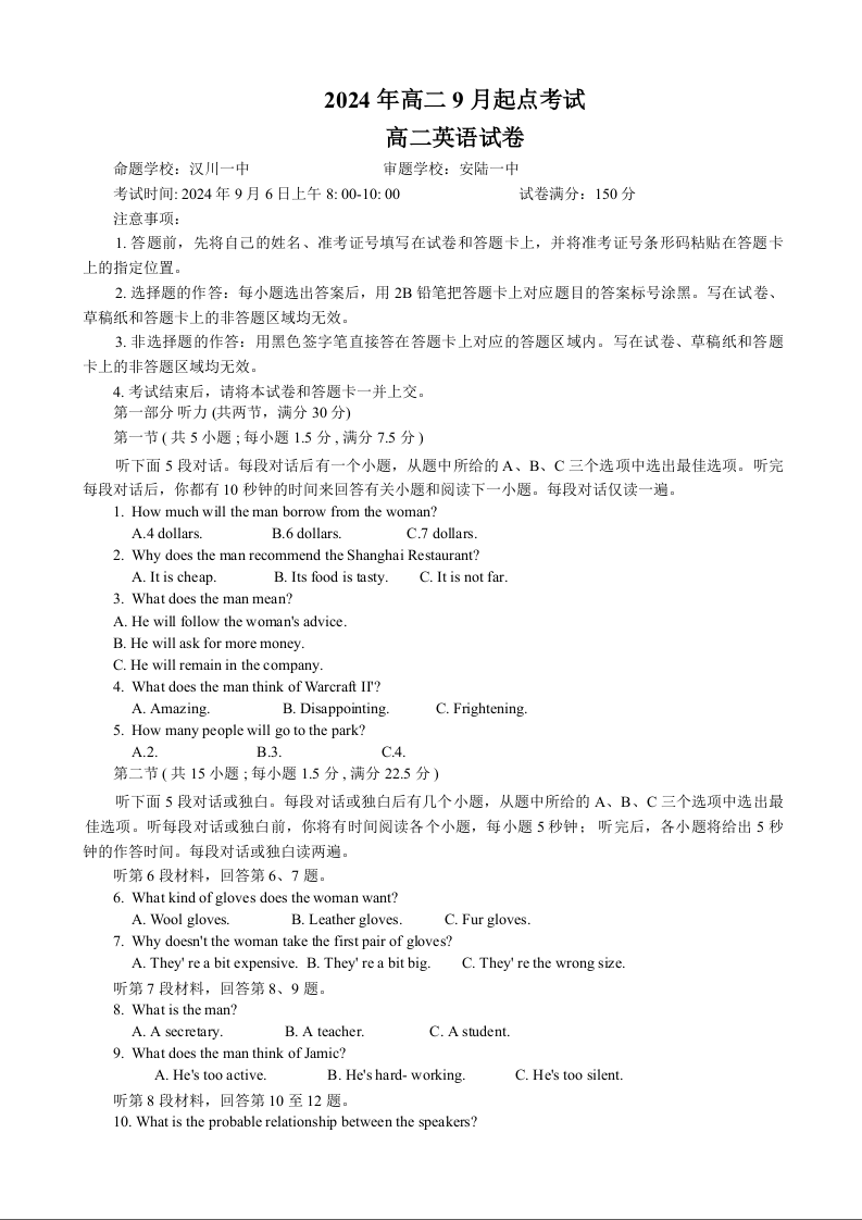 湖北省孝感市新高考联考协作体2024-2025学年高二上学期9月开学联考英语