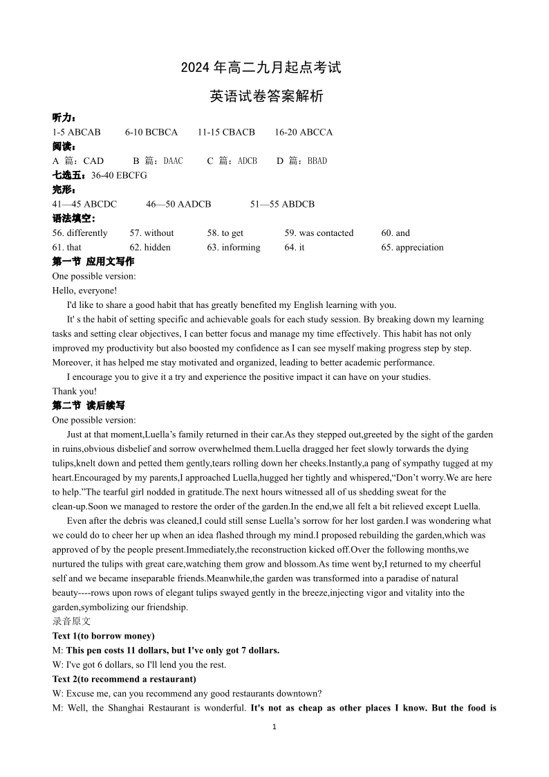 湖北省孝感市新高考联考协作体2024-2025学年高二上学期9月开学联考英语答案