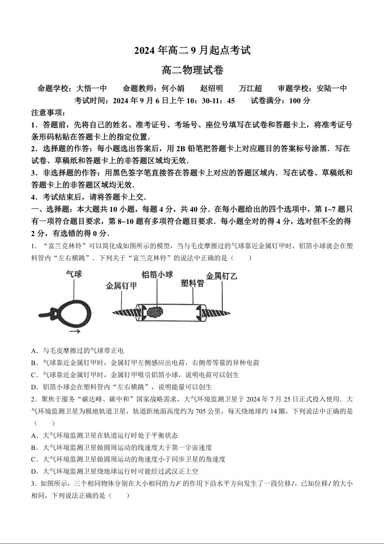 湖北省孝感市新高考联考协作体2024-2025学年高二上学期9月开学联考物理+答案