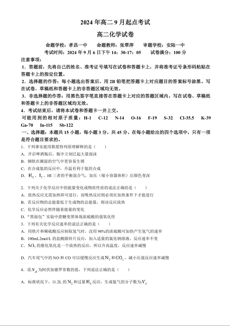 湖北省孝感市新高考联考协作体2024-2025学年高二上学期9月开学联考化学+答案