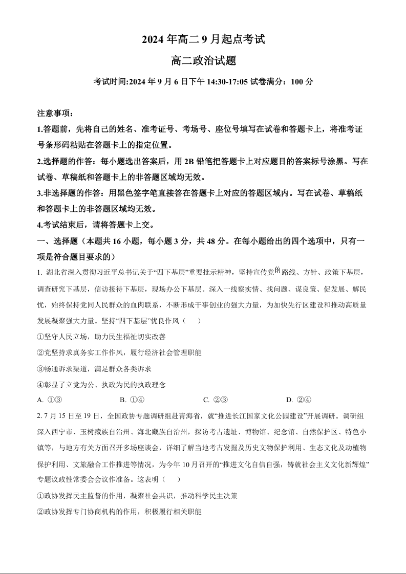 湖北省孝感市新高考联考协作体2024-2025学年高二上学期9月开学联考政治(原卷版)