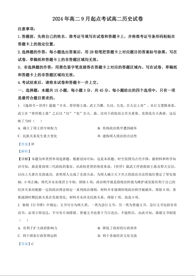 湖北省孝感市新高考联考协作体2024-2025学年高二上学期9月开学联考历史(解析版)