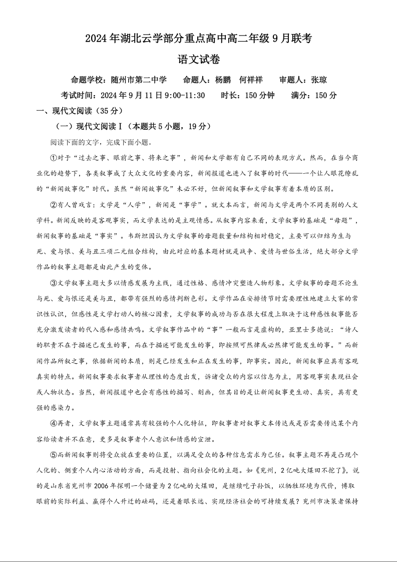 湖北省云学联盟部分重点高中2024-2025学年高二上学期9月联考语文(原卷版)