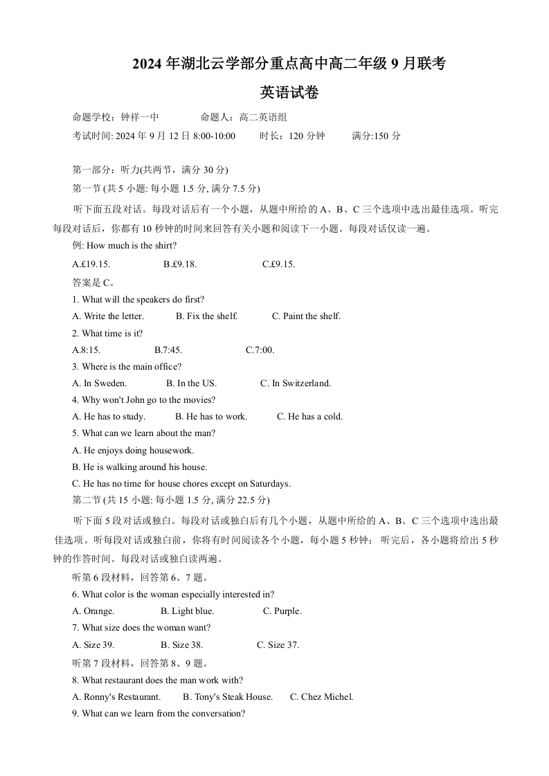 湖北省云学联盟部分重点高中2024-2025学年高二上学期9月联考英语