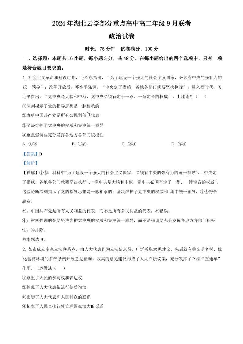 湖北省云学联盟部分重点高中2024-2025学年高二上学期9月联考政治(解析版)