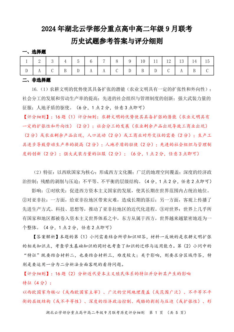 湖北省云学联盟部分重点高中2024-2025学年高二上学期9月联考历史(解析版)