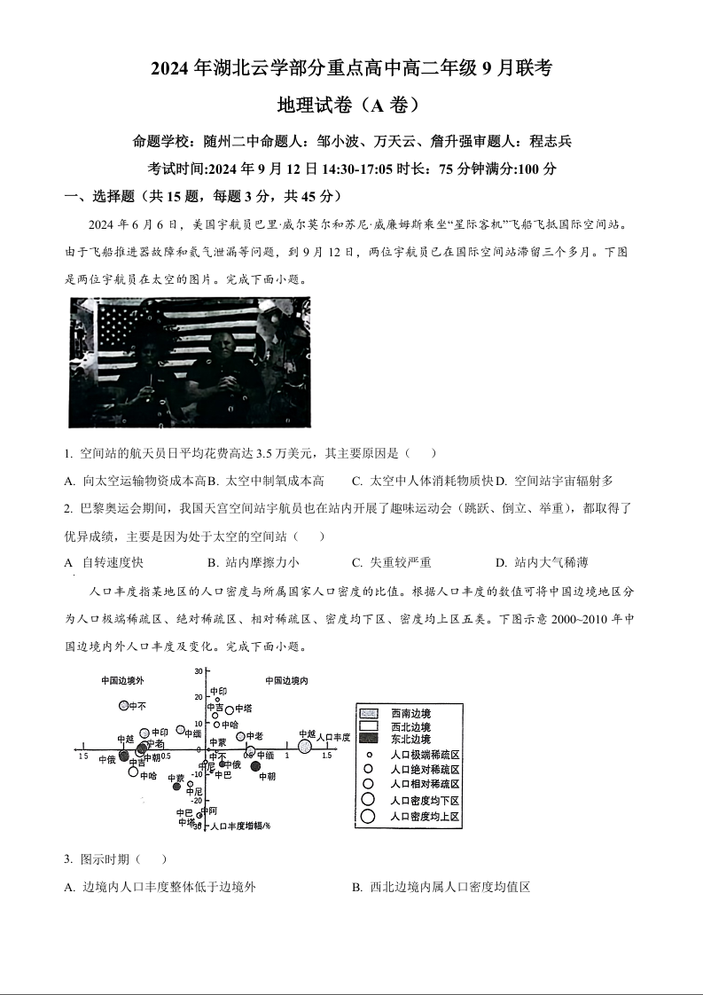 湖北省云学联盟部分重点高中2024-2025学年高二上学期9月联考地理A卷(原卷版)