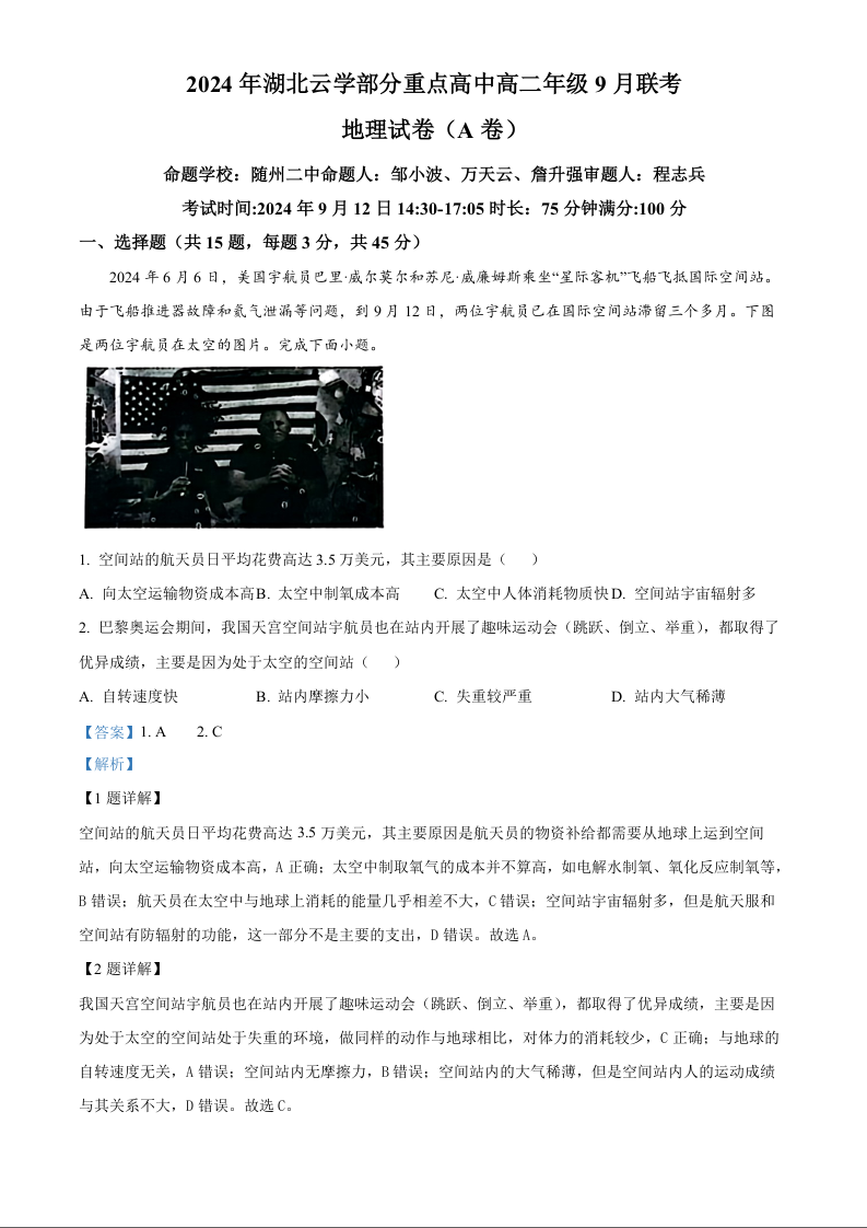 湖北省云学联盟部分重点高中2024-2025学年高二上学期9月联考地理A卷(解析版)
