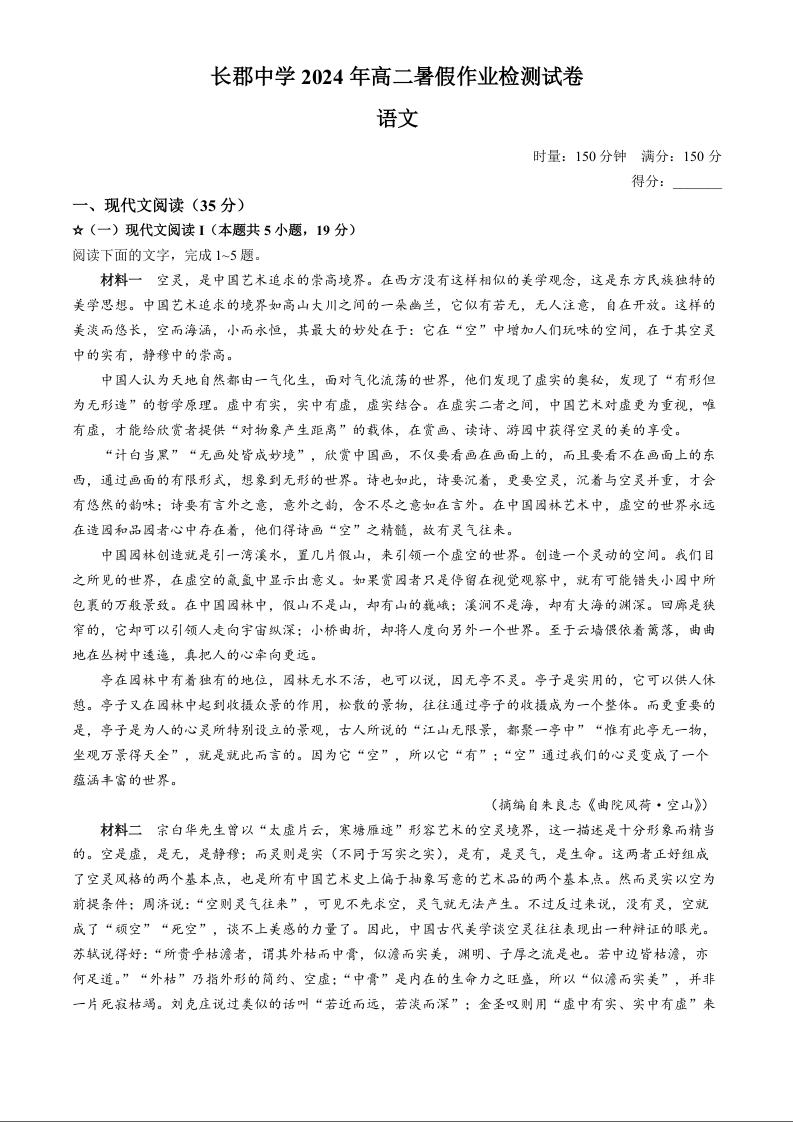 湖南省长沙市长郡中学2024-2025学年高二上学期入学考试语文+答案