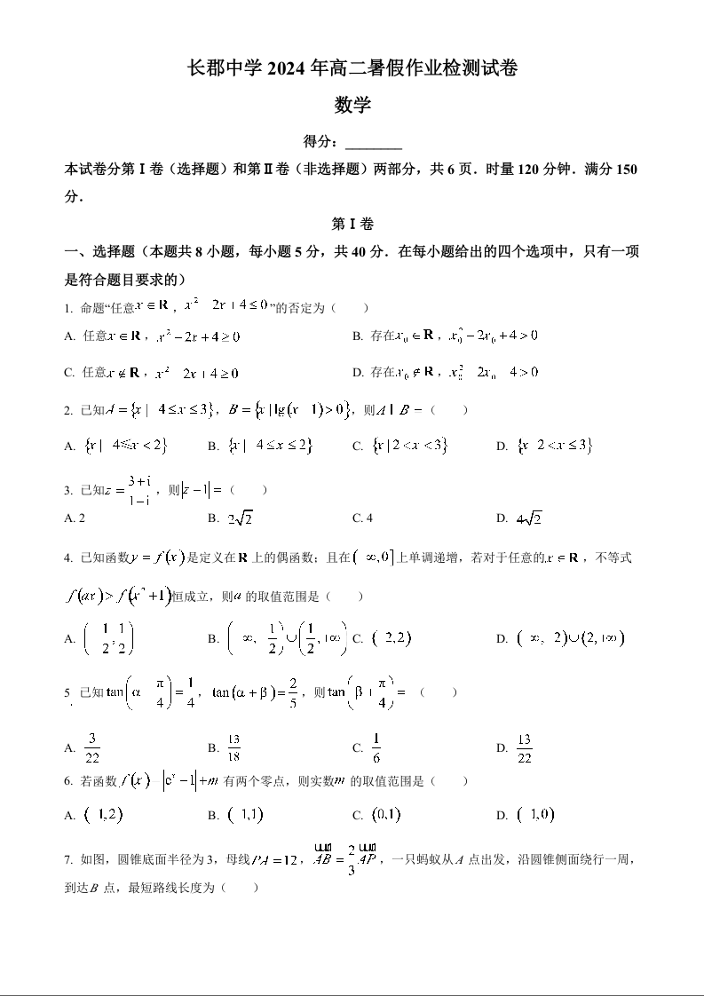 湖南省长沙市长郡中学2024-2025学年高二上学期入学考试数学(原卷版)
