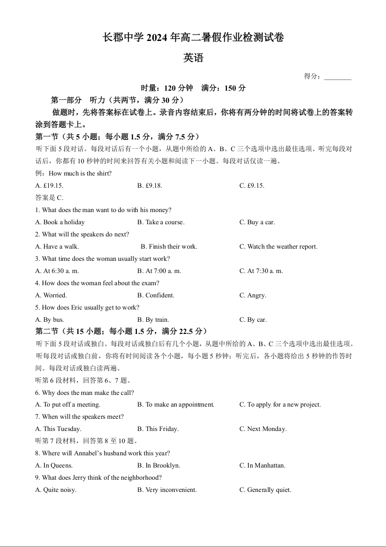 湖南省长沙市长郡中学2024-2025学年高二上学期入学考试英语+答案