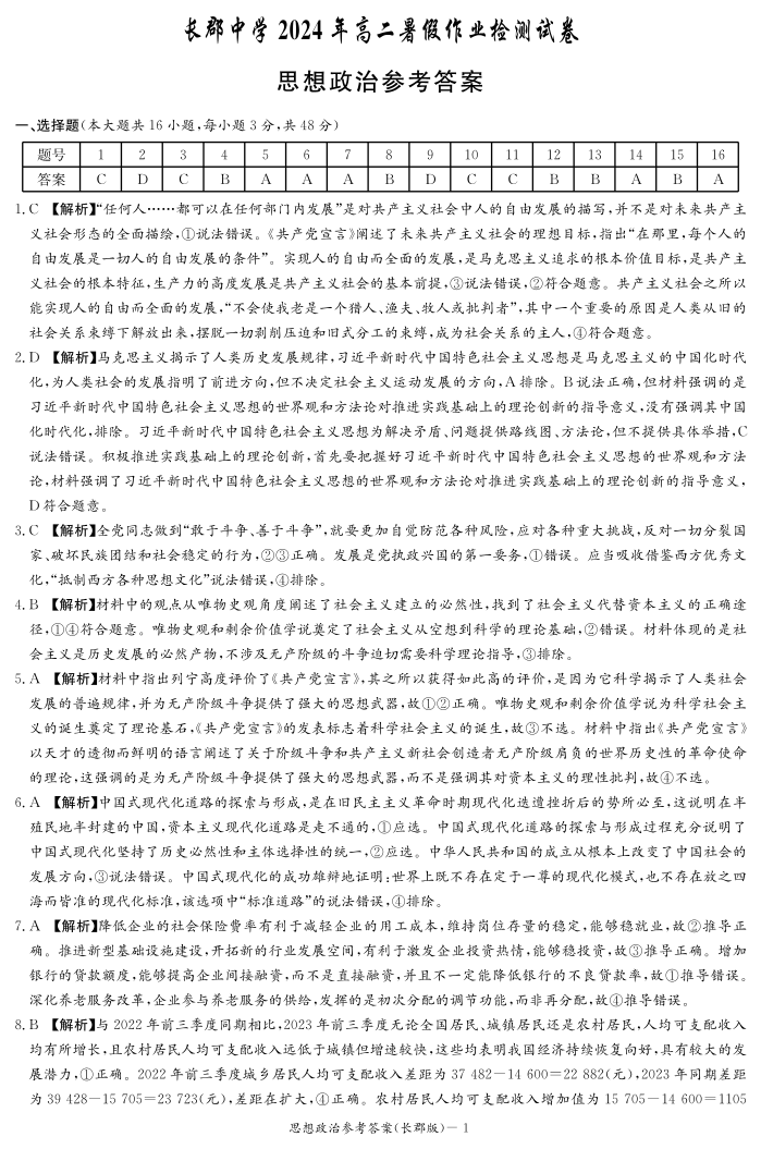 湖南省长沙市长郡中学2024-2025学年高二上学期入学考试政治答案