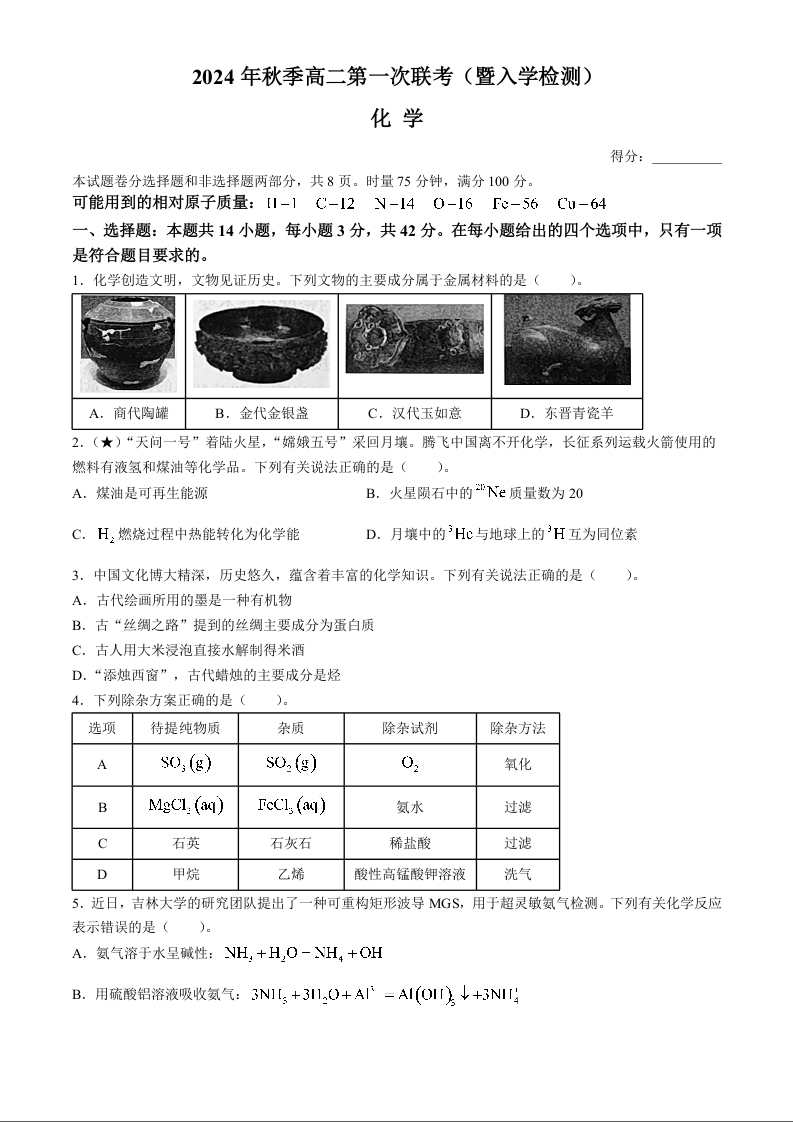 湖南省部分省示范性高中2024-2025学年高二上学期开学考试化学+答案