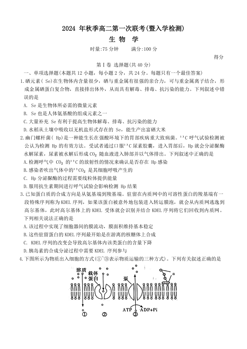 湖南省部分省示范性高中2024-2025学年高二上学期开学考试生物