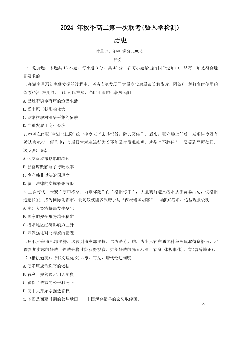 湖南省部分省示范性高中2024-2025学年高二上学期开学考试历史