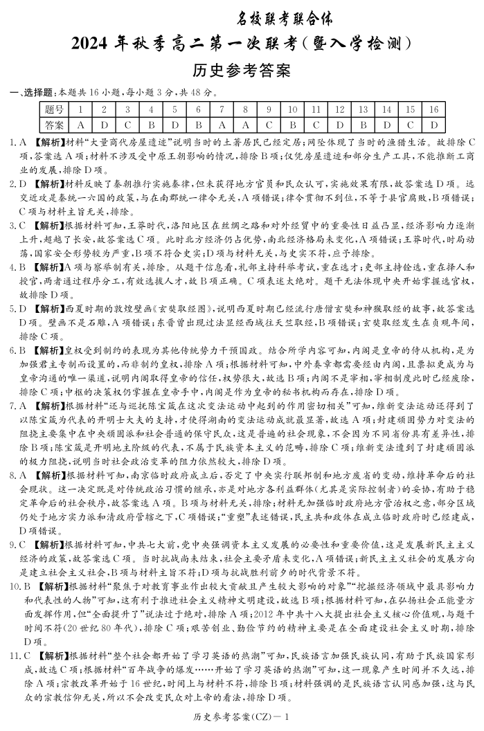 湖南省部分省示范性高中2024-2025学年高二上学期开学考试历史答案