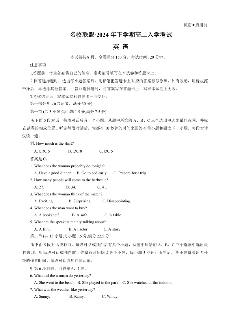 湖南省名校联盟2024-2025学年高二上学期入学考试英语