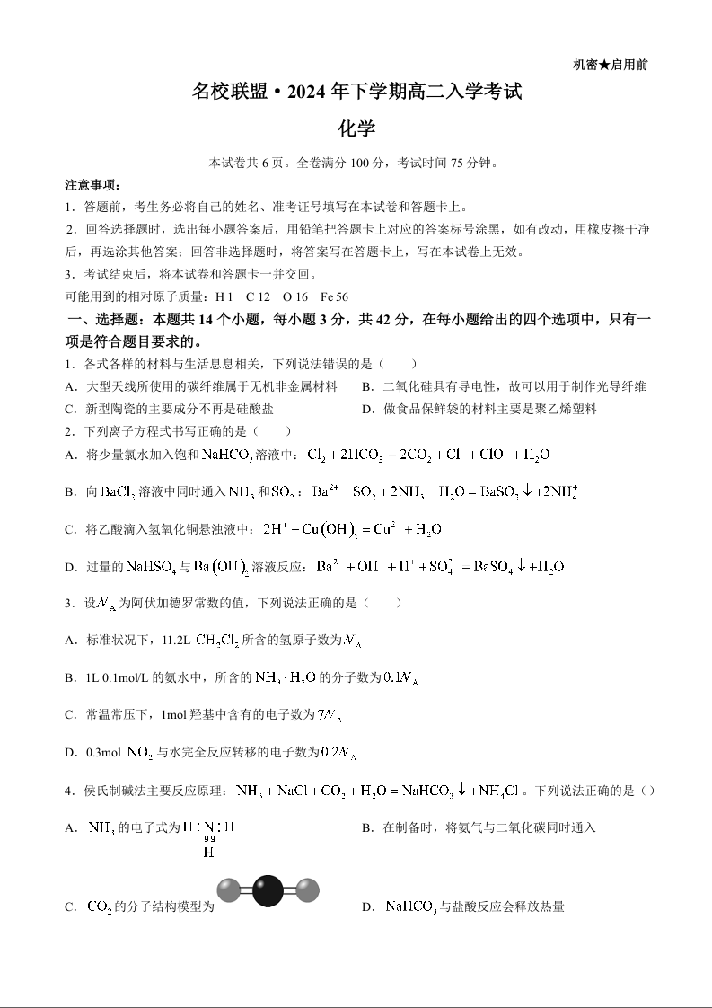湖南省名校联盟2024-2025学年高二上学期入学考试化学+答案