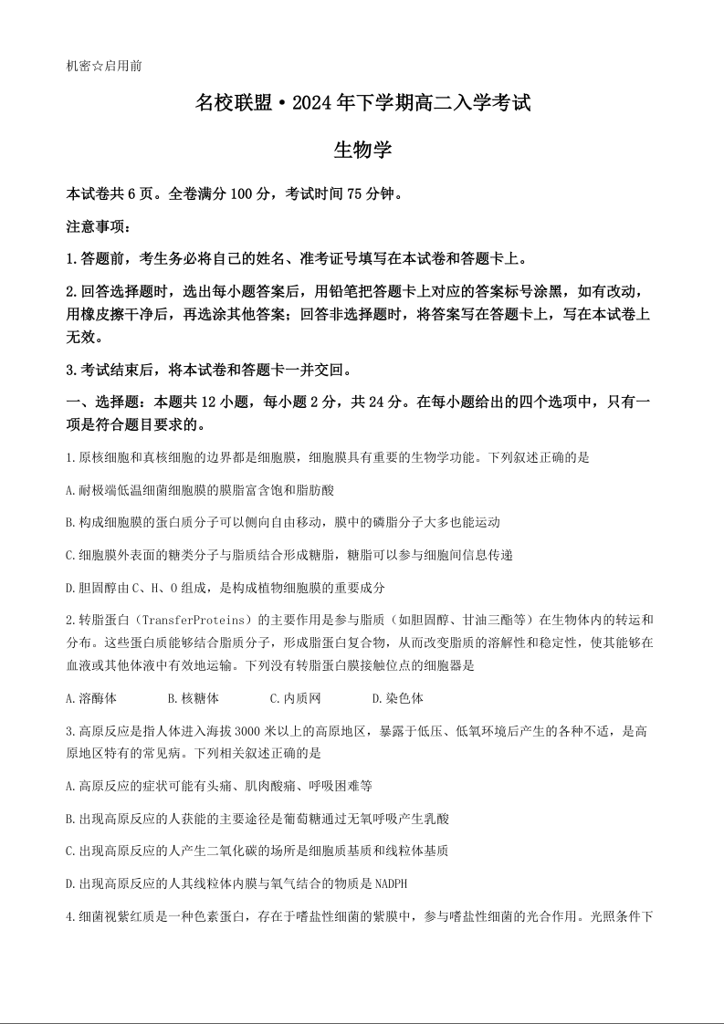 湖南省名校联盟2024-2025学年高二上学期入学考试生物+答案