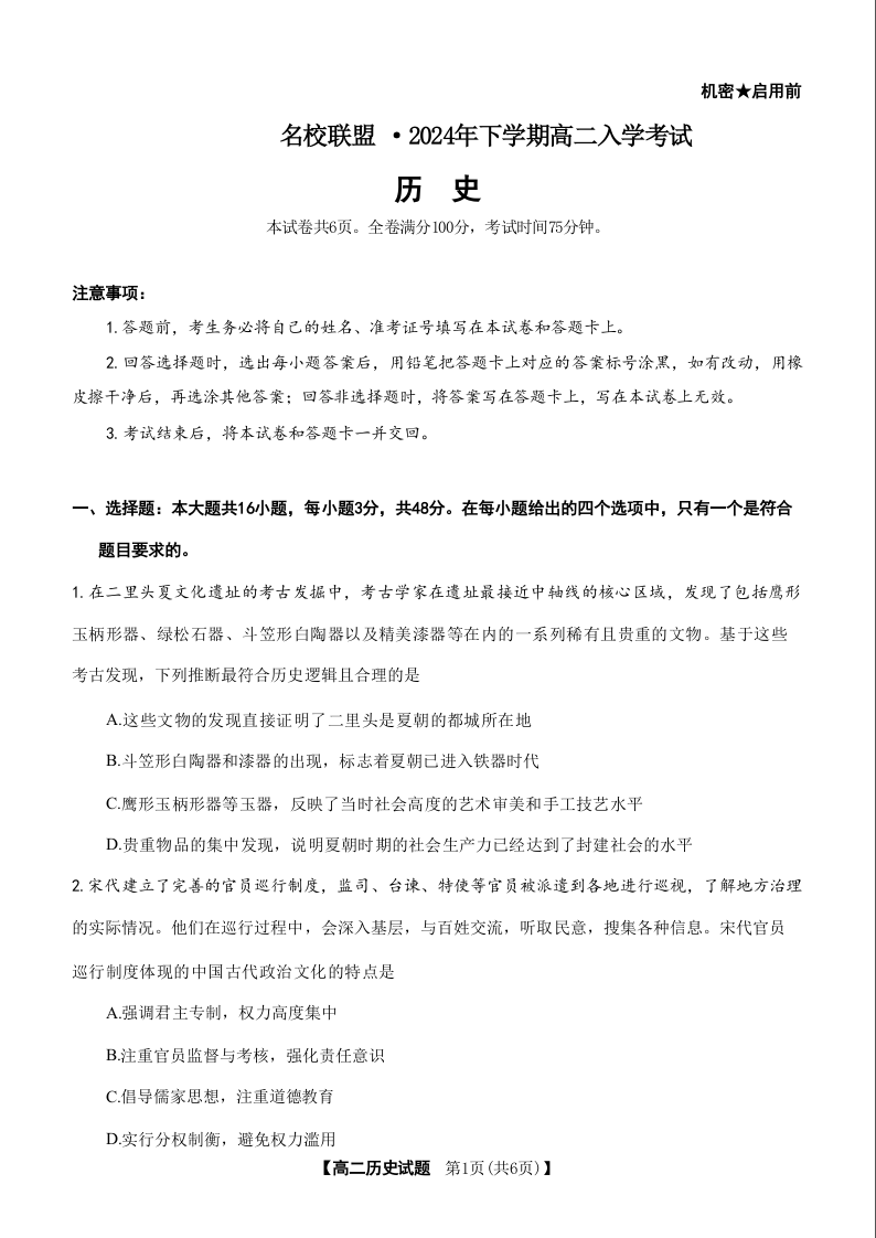 湖南省名校联盟2024-2025学年高二上学期入学考试历史+答案