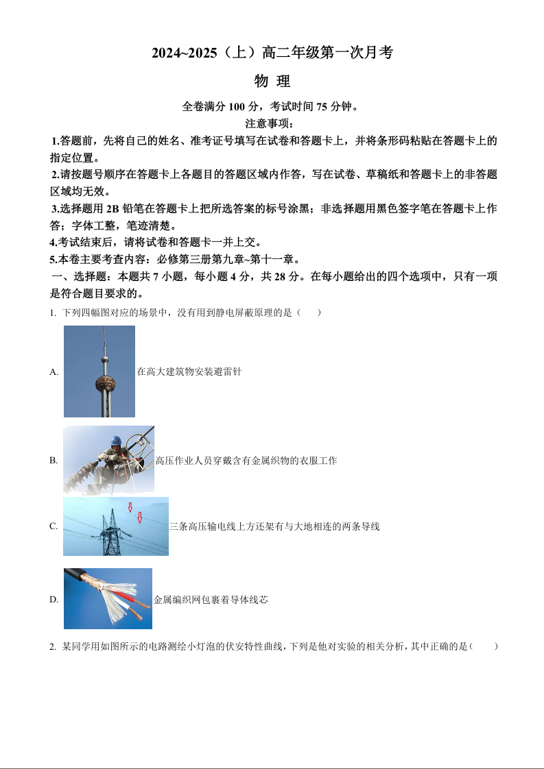 吉林省四校联考2024-2025学年高二上学期9月月考试题物理+答案