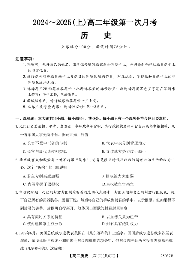 吉林省四校联考2024-2025学年高二上学期9月月考试题历史+答案