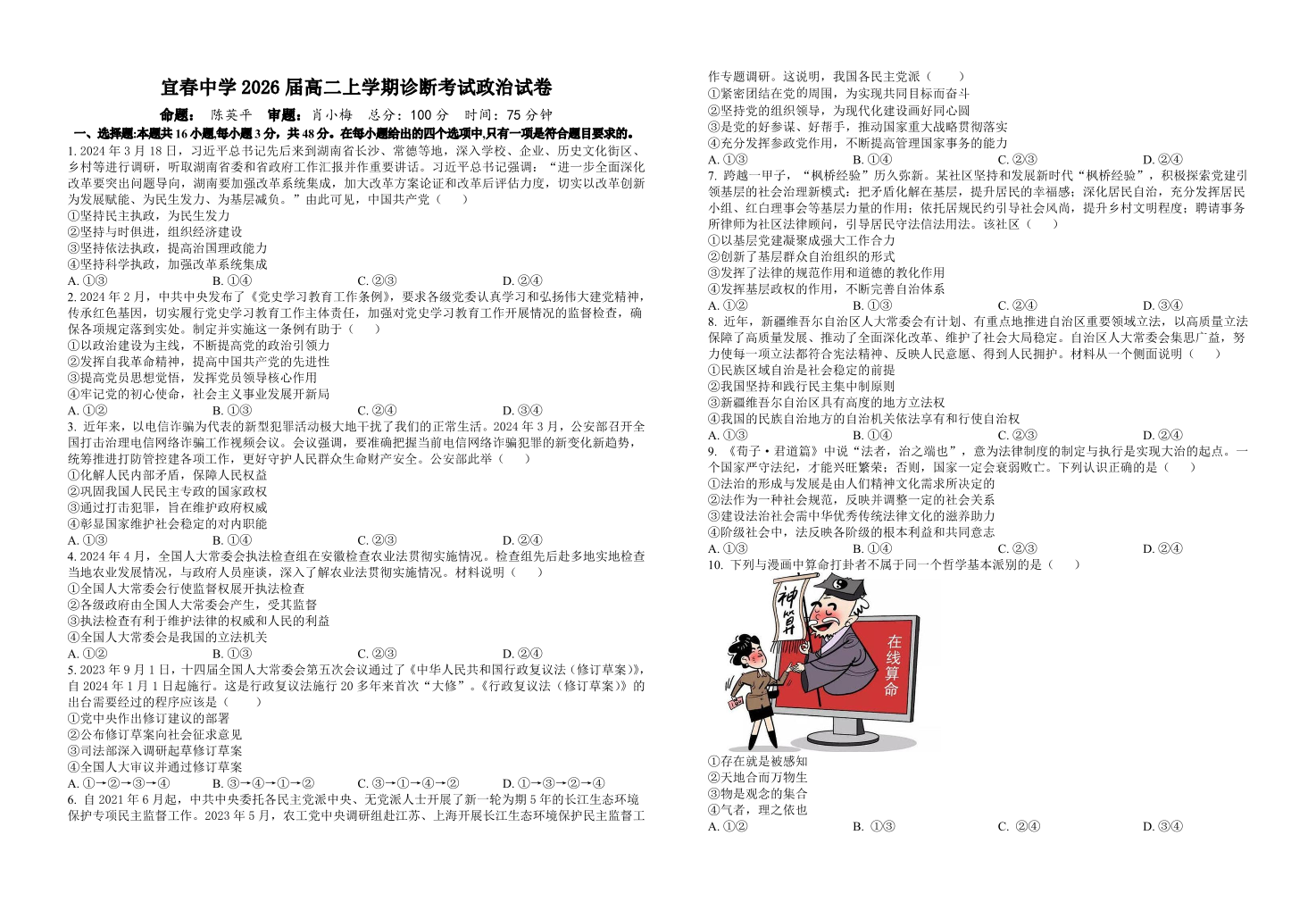 江西省宜春市2024-2025学年高二上学期开学考试政治+答案