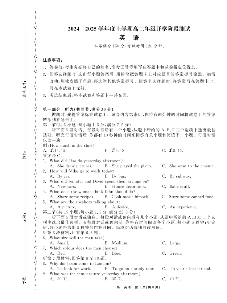 辽宁省部分高中2024-2025学年高二上学期9月开学联合考试英语+答案