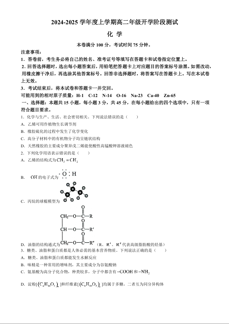 辽宁省部分高中2024-2025学年高二上学期9月开学联合考试化学+答案