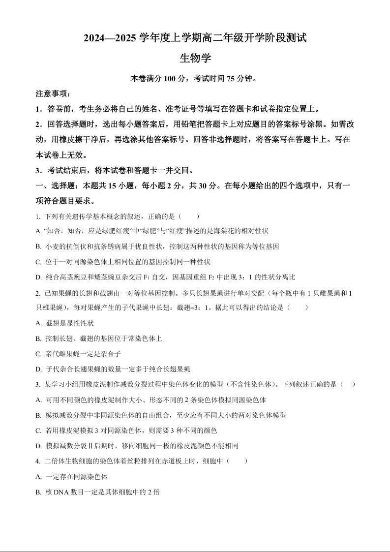 辽宁省部分高中2024-2025学年高二上学期9月开学联合考试生物+答案