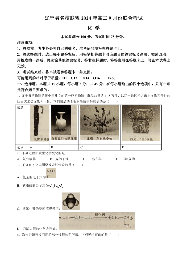 辽宁省名校联盟2024-2025学年高二上学期9月联合考试化学+答案
