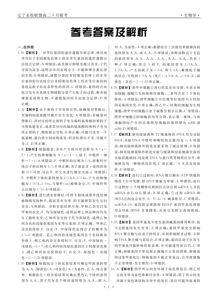辽宁省名校联盟2024-2025学年高二上学期9月联合考试生物答案