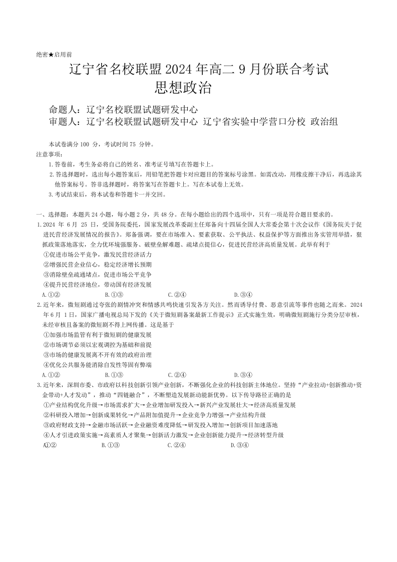 辽宁名校联盟2024-2025学年高二上学期9月联考政治