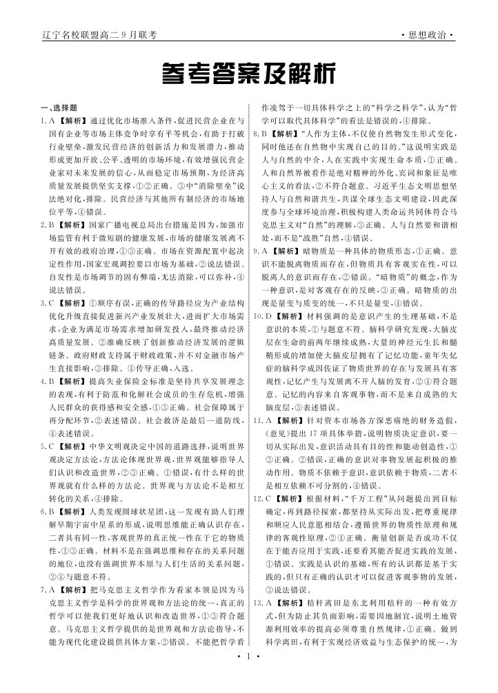 辽宁名校联盟2024-2025学年高二上学期9月联考政治答案