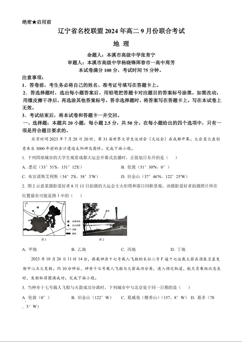 辽宁省名校联盟2024-2025学年高二上学期9月联合考试地理+答案