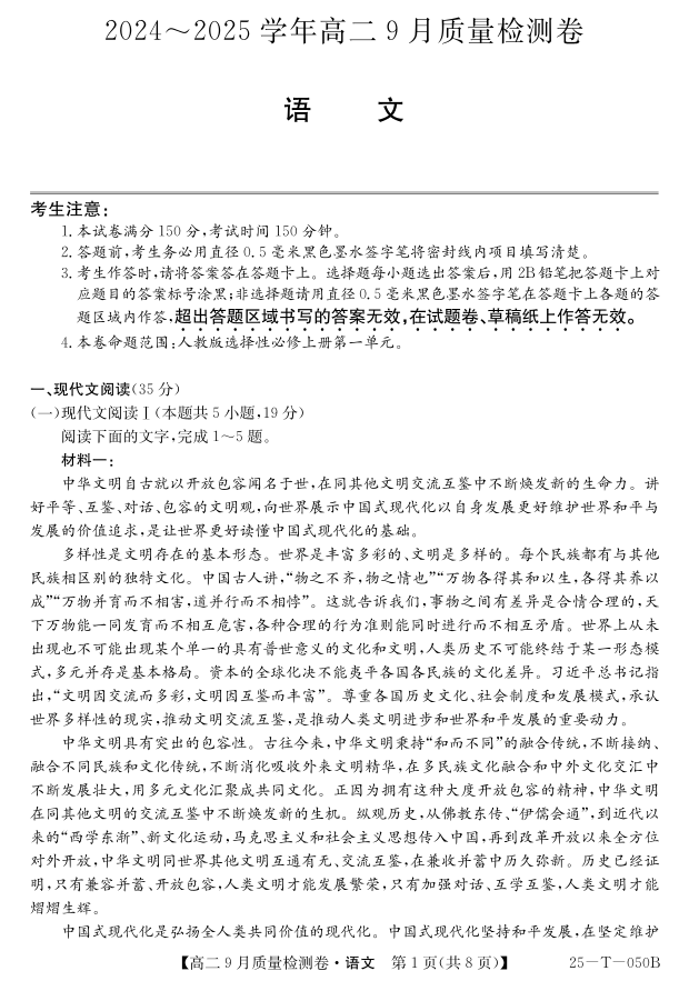 山西省吕梁市部分学校2024-2025高二上学期9月考试语文