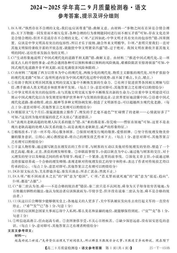 山西省吕梁市部分学校2024-2025高二上学期9月考试语文答案
