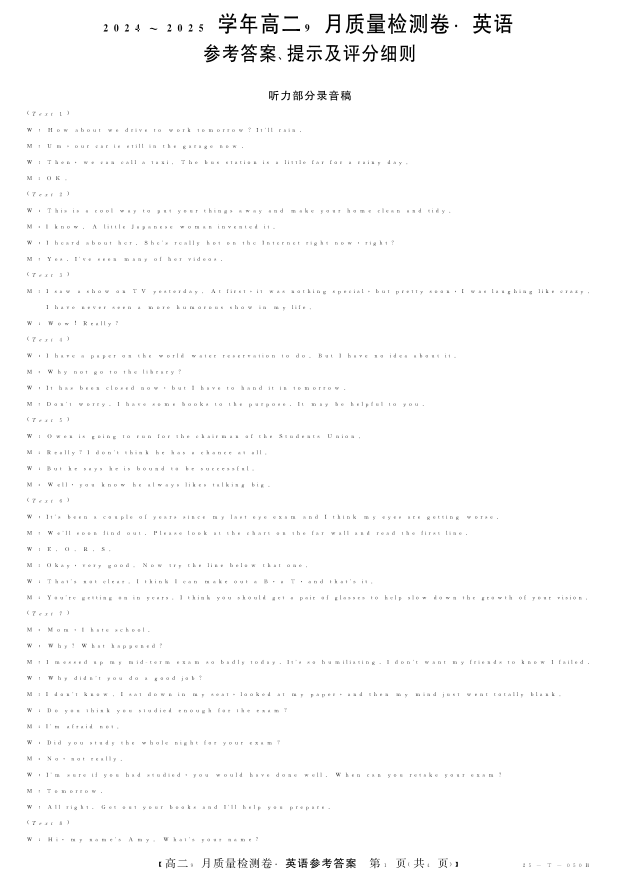 山西省吕梁市部分学校2024-2025高二上学期9月考试英语答案