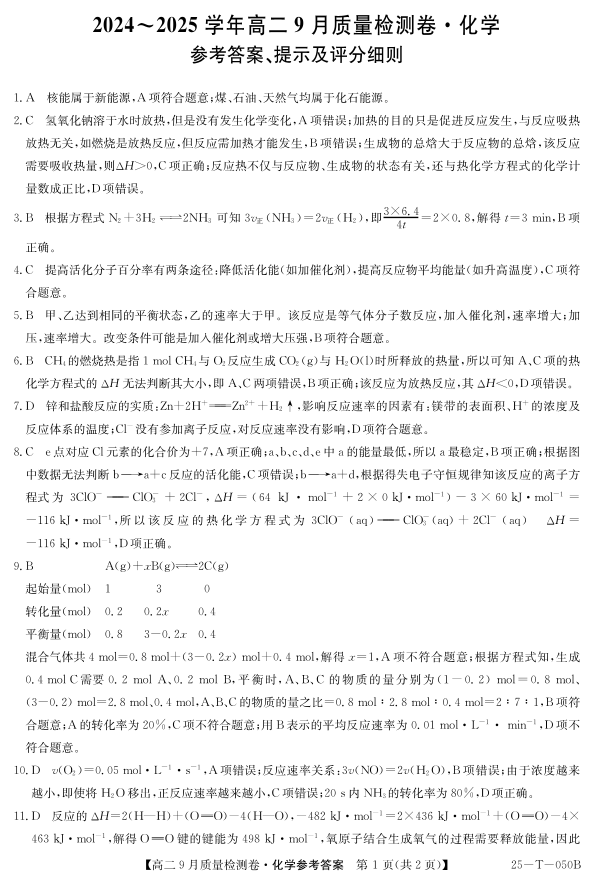 山西省吕梁市部分学校2024-2025高二上学期9月考试化学答案