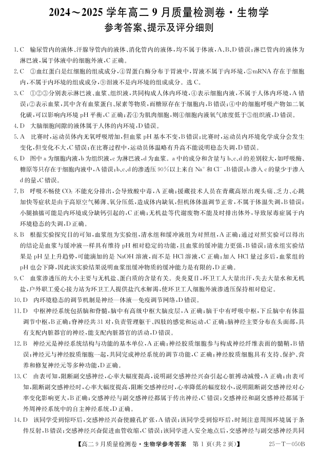 山西省吕梁市部分学校2024-2025高二上学期9月考试生物答案