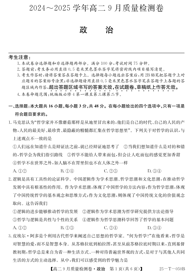 山西省吕梁市部分学校2024-2025高二上学期9月考试政治