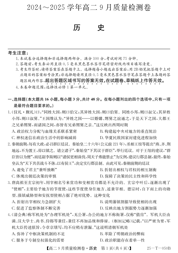 山西省吕梁市部分学校2024-2025高二上学期9月考试历史